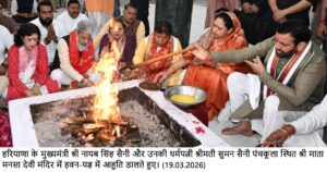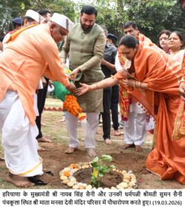 नई दिल्ली 19 मार्च: हरियाणा के मुख्यमंत्री नायब सिंह सैनी ने अपनी धर्मपत्नी श्रीमती सुमन सैनी के साथ चैत्र नवरात्र के प्रथम दिन पंचकूला पहुंचकर माता मनसा देवी मंदिर में माथा टेककर पूजा-अर्चना की और महामाई का आशीर्वाद लिया। उन्होंने प्रदेशवासियों के सुख, शांति एवं समृद्धि की कामना की।